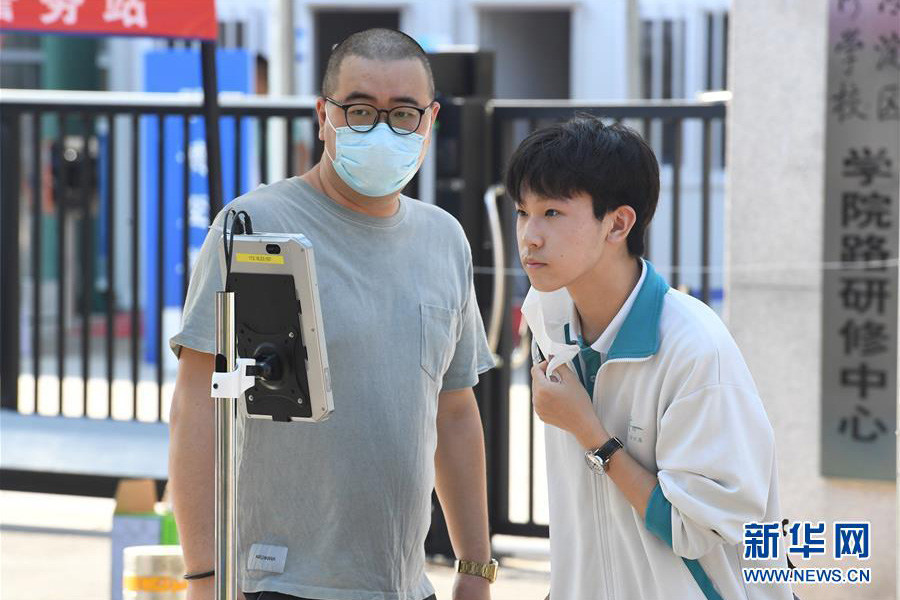 7月7日,在北京科技大學附屬中學考點,考生(右)在進入考場前進行人臉識別。(新華社記者 任超/攝)