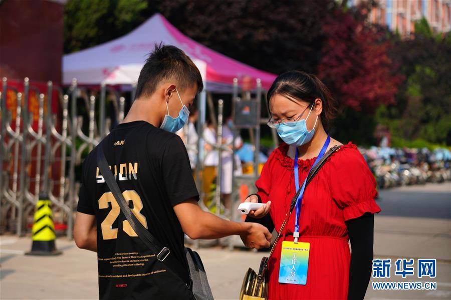 7月7日,在河北南宮中學考點外,工作人員為考生測量體溫。(新華社記者 牟宇/攝)