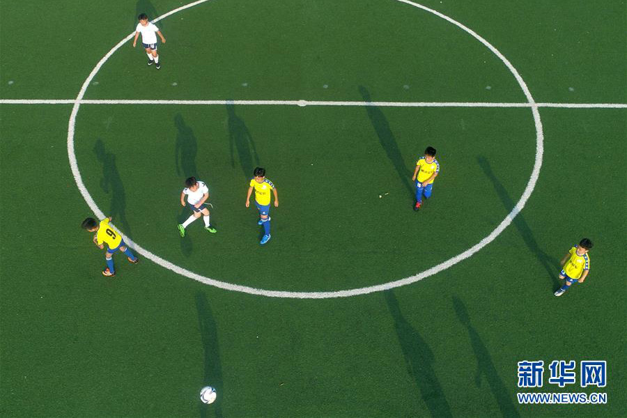 7月16日,青島通濟實驗學校的小球員在足球場上進行比賽(無人機照片)。(新華社發 梁孝鵬/攝)