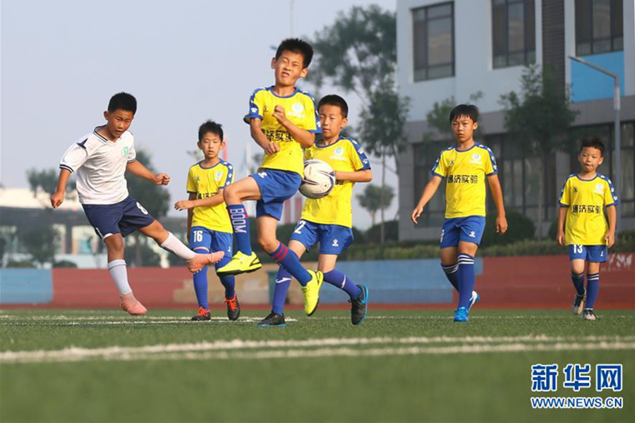 7月16日,青島通濟實驗學校的小球員在足球場上進行比賽。(新華社發 梁孝鵬/攝)