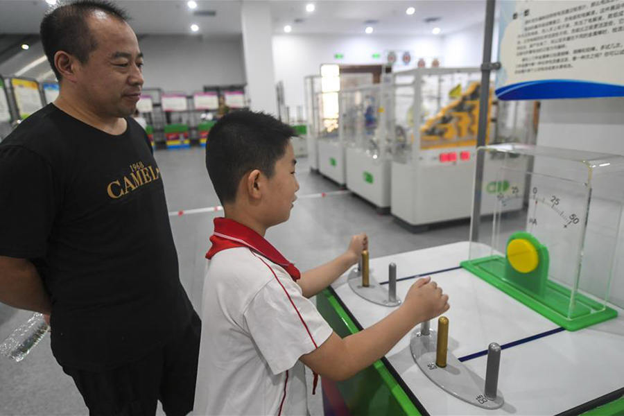 8月4日,小朋友在中國流動科技館河北巡展永清站體驗“手蓄電池”儀器。(新華社記者 李曉果/攝)