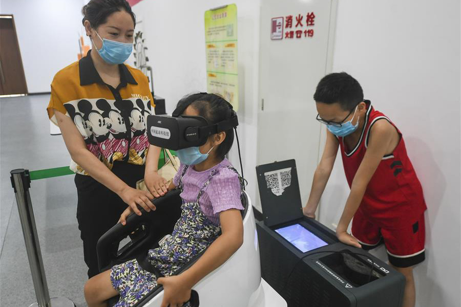 8月4日,小朋友在中國流動科技館河北巡展永清站體驗“虛擬現實動感座椅”。 (新華社記者 李曉果/攝)