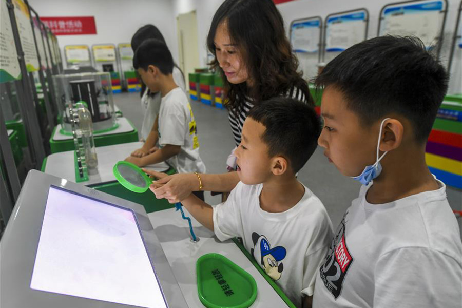 8月4日,小朋友在中國流動科技館河北巡展永清站體驗。暑假期間,許多小朋友在家長的陪伴下來到中國流動科技館河北巡展永清站,參觀各類科普項目展陳,動手參與科普游戲活動,在玩耍中拓寬視野、增長知識。(新華社記者 李曉果/攝)
