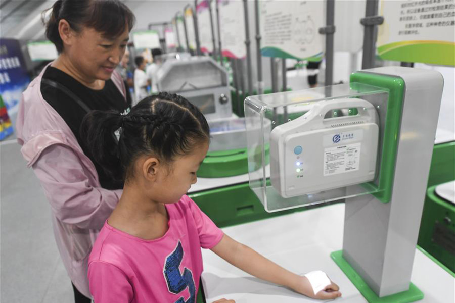 8月4日,小朋友在中國流動科技館河北巡展永清站體驗“紅外血管成像”。 (新華社記者 李曉果/攝)