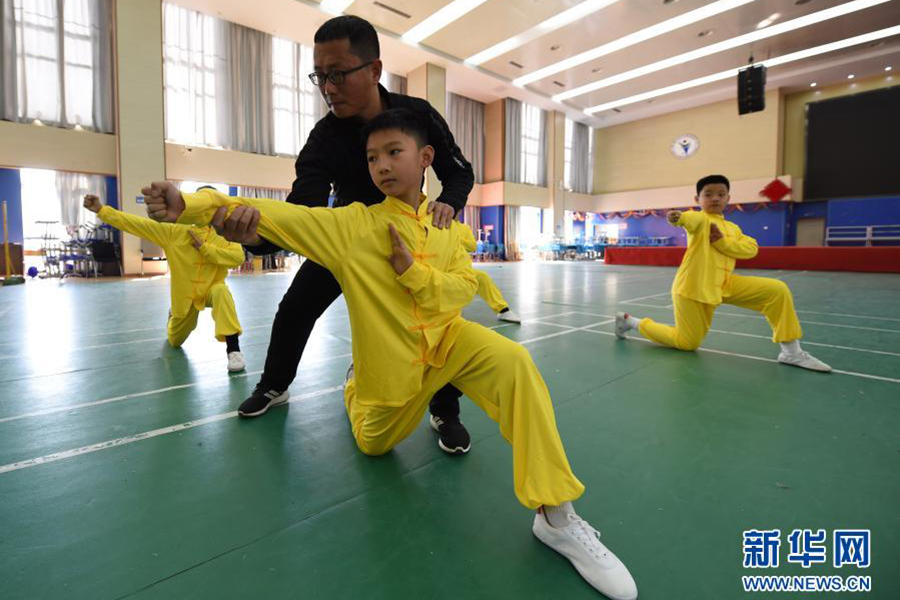 1月13日,合肥市一六八玫瑰園學校武術社團的學生在教練指導下練習武術。(新華社記者 周牧/攝)