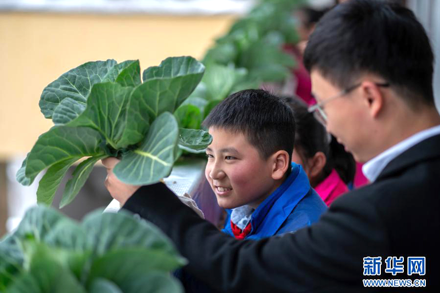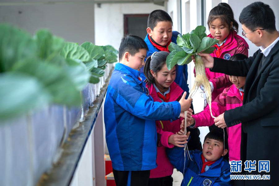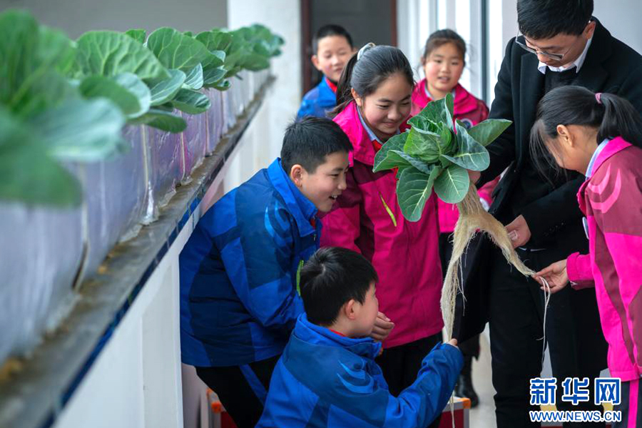 1月22日,高溪小學的學生們在老師的帶領下在教學樓走廊上觀察成熟的蔬菜及根須。(新華社記者 徐昱/攝)