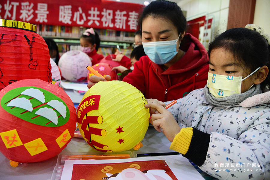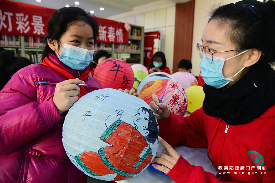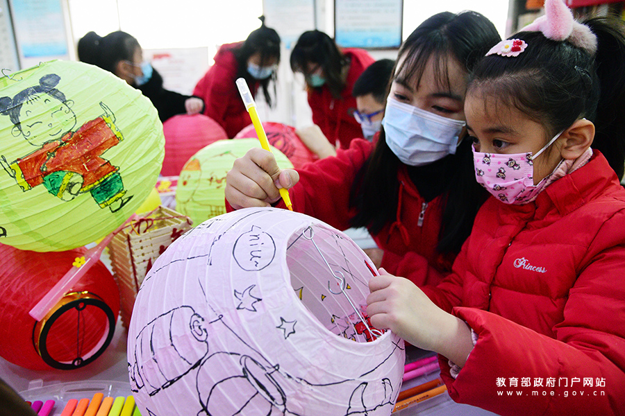 1月24日,鎮江市廣東山莊社區,江蘇大學志愿者在指導小朋友繪制年俗主題燈籠。(石玉成/攝)