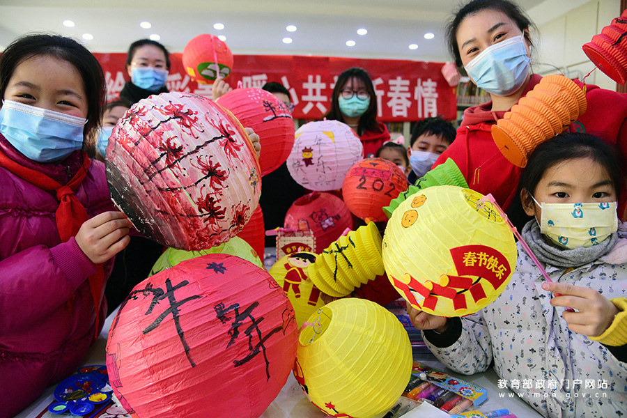 1月24日,鎮江市廣東山莊社區,江蘇大學志愿者和小朋友共同展示繪制的年俗主題燈籠。(石玉成/攝)