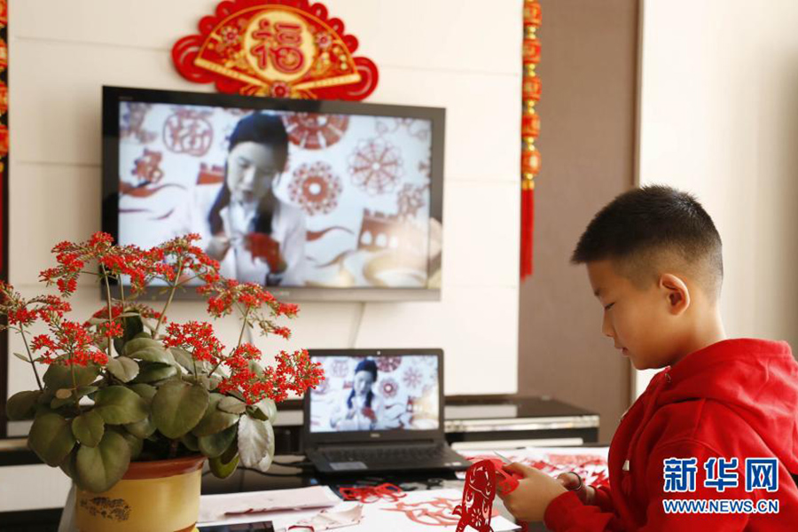 2月7日,河北省邢臺市第三中學附屬小學的學生通過網絡跟隨老師學習剪紙。(新華社發 張馳/攝)