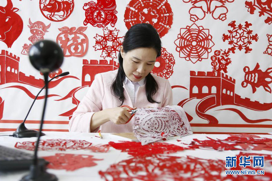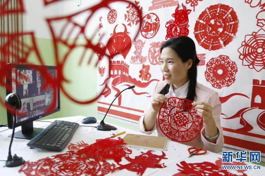 2月7日,河北省邢臺市第三中學附屬小學的老師通過網絡向學生展示剪紙作品。(新華社發 張馳/攝)