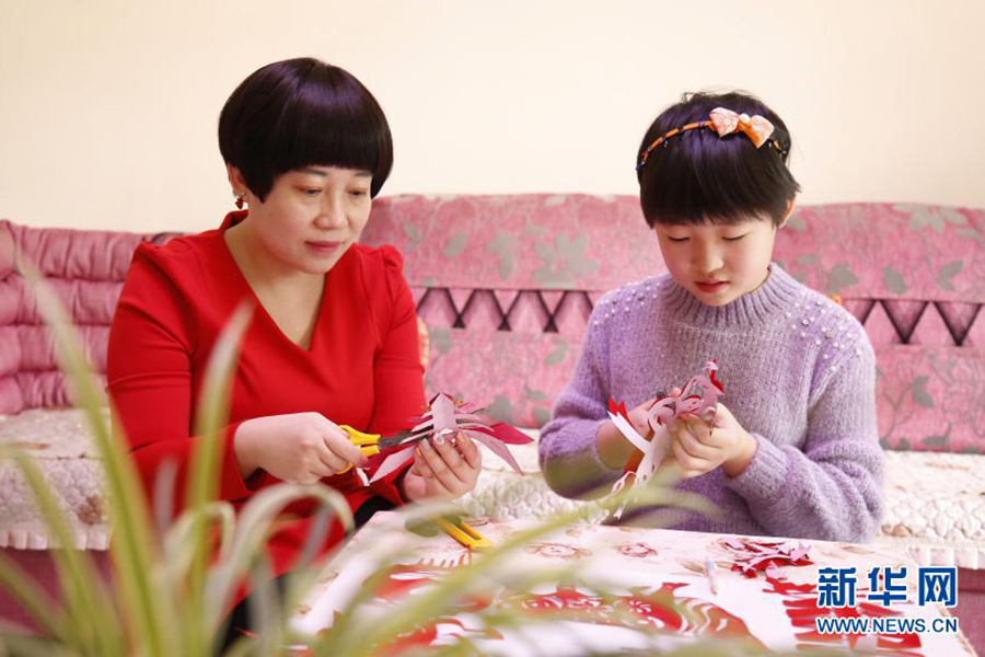 2月7日,河北省邢臺市第三中學附屬小學的學生和家長通過網絡跟隨老師學習剪紙。(新華社發 張馳/攝)
