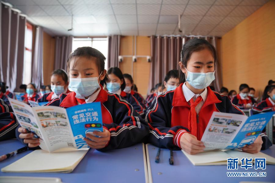 3月3日,河北省沙河市第四中學學生在閱讀交通安全知識手冊。(新華社記者 牟宇/攝)