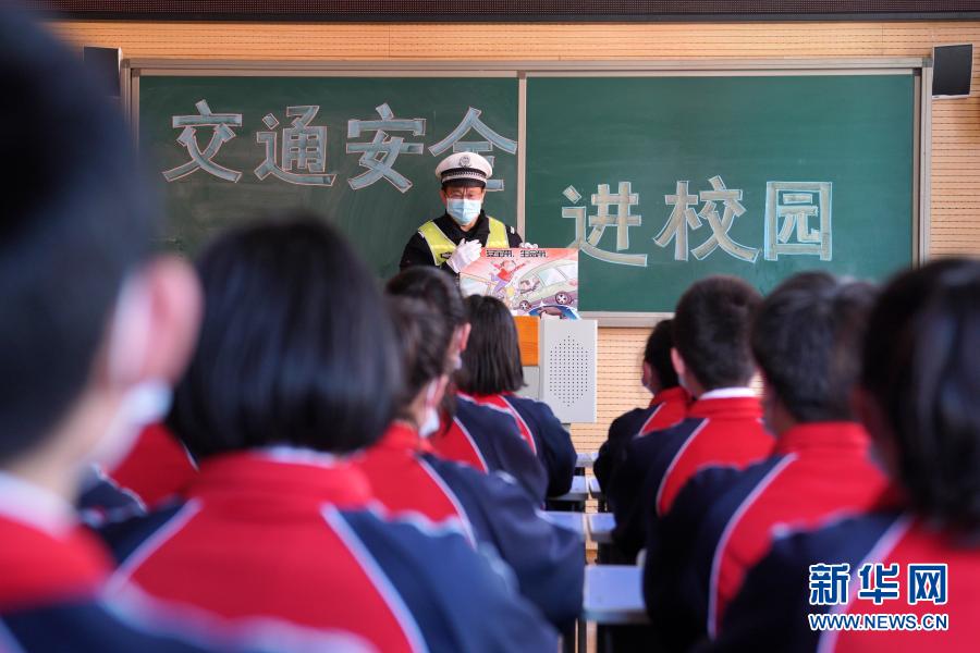 3月3日,河北省沙河市交警大隊民警在沙河市第四中學為學生講解交通安全知識。新學期伊始,河北省沙河市交警大隊聯合轄區內多所中小學開展“文明交通宣傳進校園”活動。交警們通過現場講解、展板展示、發放讀物等方式,為學生普及交通安全知識,培養學生的文明交通意識。(新華社記者 牟宇/攝)