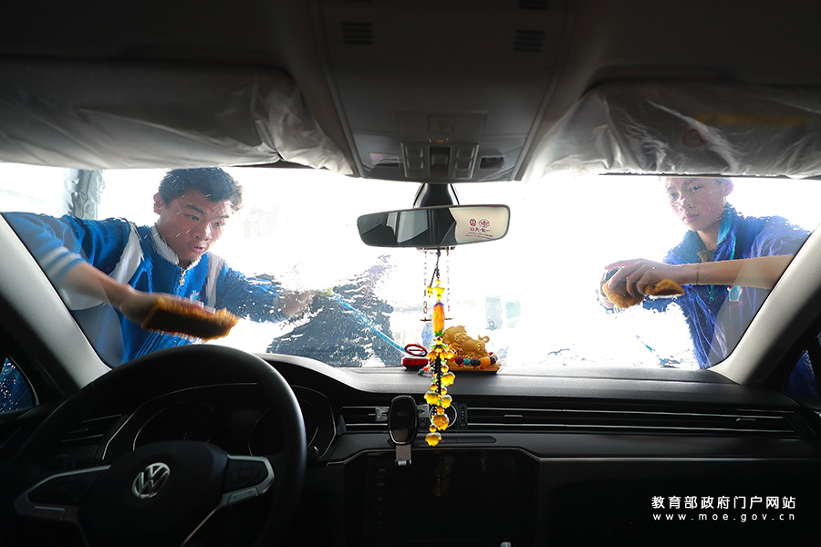 3月23日,貴州省務川縣特教學校學習洗車美容的學生在車間實習。(鄭啟彥、張學軍/攝)