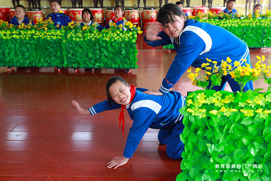 3月23日,貴州省務川縣特教學校學生在排練《牧牛童趣》,準備參加貴州省特校文藝會演。(鄭啟彥、張學軍/攝)