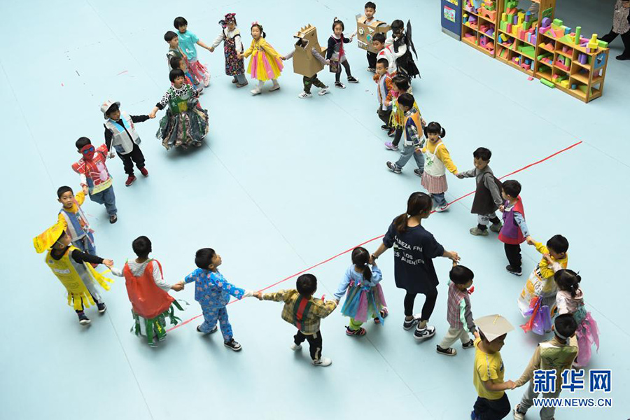 4月22日,老師帶著身穿環保時裝的孩子們做游戲。(新華社記者 翁忻旸/攝)