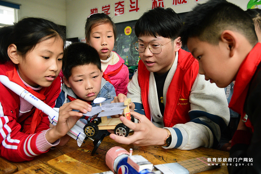 4月23日,在江蘇省鎮江市官塘橋中心小學,江蘇大學志愿者在指導小學生制作航天空間站模型。當日,江蘇省鎮江市官塘橋中心小學聯合江蘇大學志愿者開展主題活動,指導小學生拼裝制作長征運載火箭、航天空間站、探月太空小車、人造地球衛星等航天模型,學習航天科普知識,迎接4月24日中國航天日的到來。(石玉成/攝)