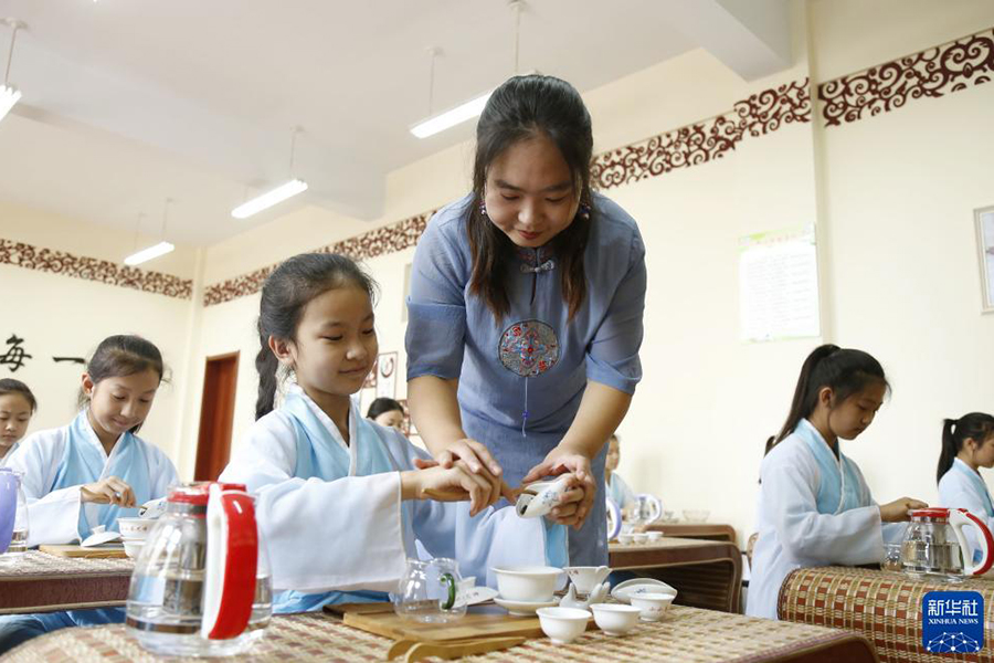 9月22日,邢臺市立德小學學生參加茶藝興趣晚托班。(新華社發 張馳/攝)