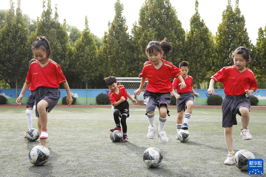 9月22日,邢臺市立德小學學生參加足球興趣晚托班。(新華社發 張馳/攝)