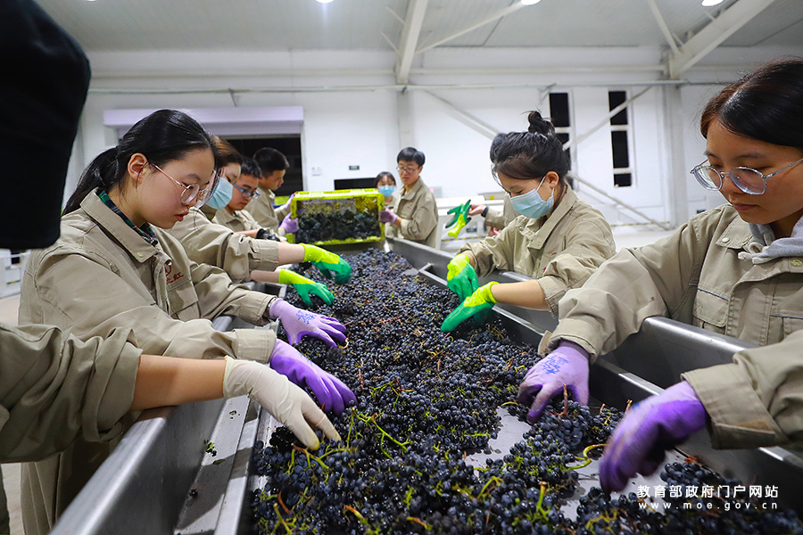 在西北農林科技大學寧夏賀蘭山東麓葡萄酒試驗示范站釀造車間,實習學生正在進行葡萄原料分選,這是葡萄酒釀造質量控制非常重要的一個環節。(張學軍 王學鋒/攝)