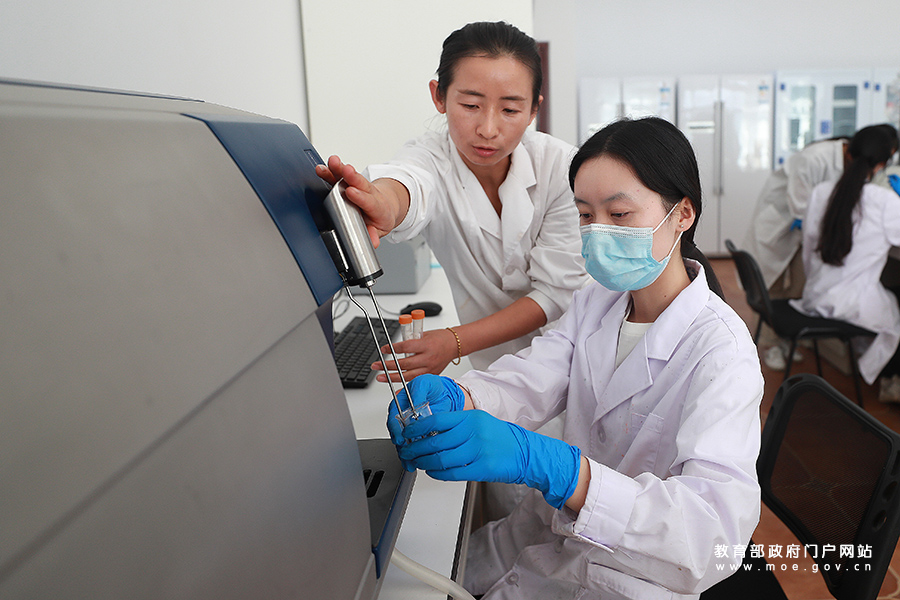在西北農林科技大學寧夏賀蘭山東麓葡萄酒試驗示范站,駐站研究生正在試驗站分析檢測中心主任的指導下,對葡萄汁理化指標進行分析。(張學軍 王學鋒/攝)