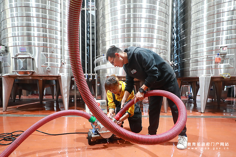 在寧夏賀蘭山東麓的酒莊,車間主管正在指導西北農林科技大學本科生開展葡萄入罐后冷浸漬期間封閉循環實習。(張學軍 王學鋒/攝)