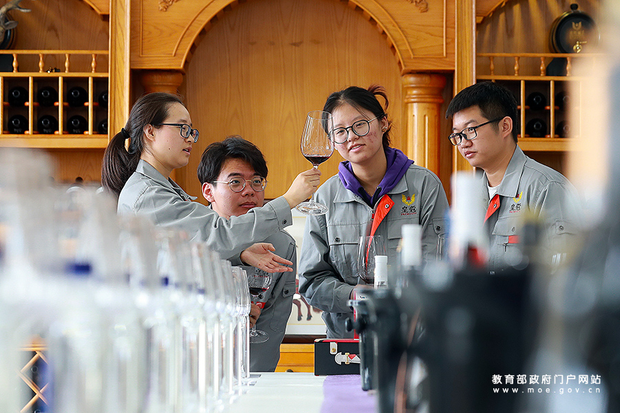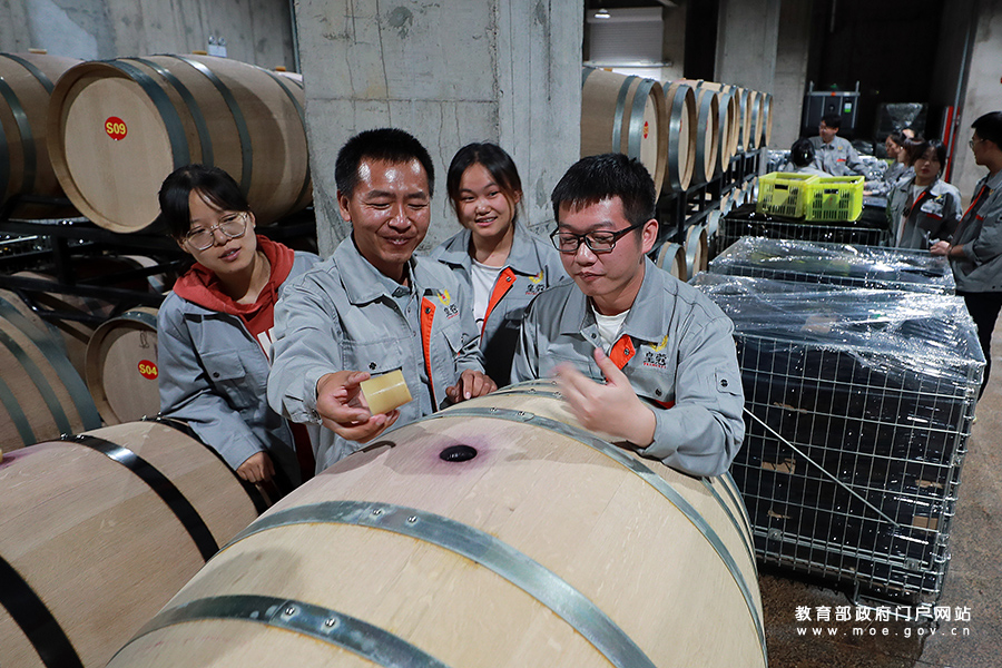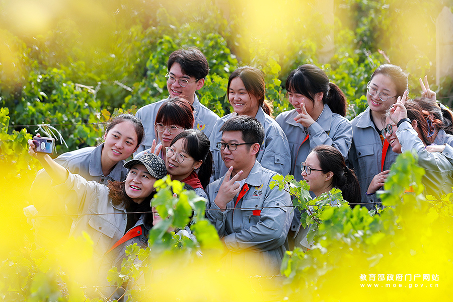 在寧夏賀蘭山東麓釀酒葡萄種植園,酒莊工作人員帶領西北農林科技大學實習學生辨識葡萄原料,為后續葡萄酒釀造積累經驗,并留下實習難忘瞬間。(張學軍 王學鋒/攝)