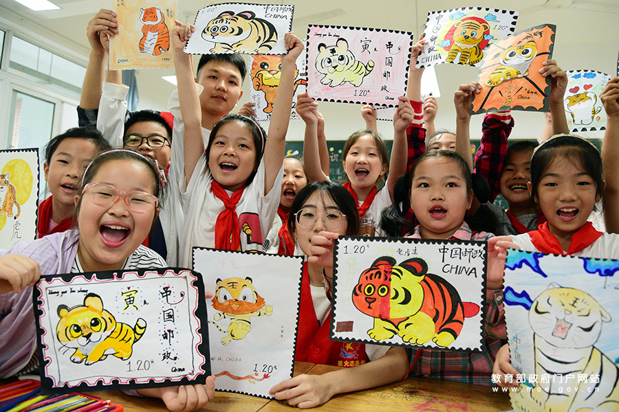 10月8日,在江蘇省鎮江市潤商小學,江蘇科技大學志愿者和小學生在展示設計繪制的虎年生肖郵票。(石玉成/攝)