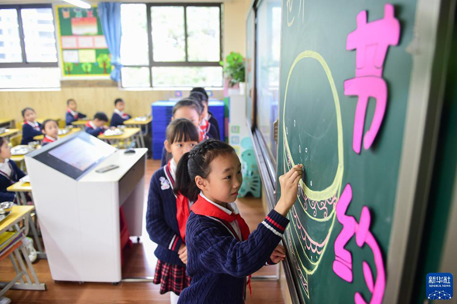 10月15日,在合肥市翡翠學校三年級七班,孩子們在黑板上的“碗”中畫下一粒米。(新華社記者 杜宇/攝)