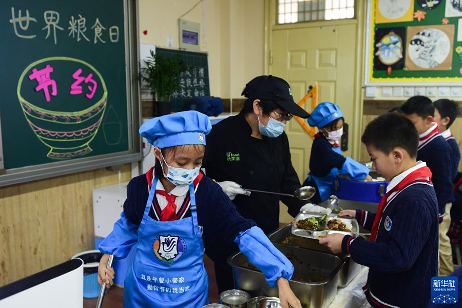 10月15日,在合肥市翡翠學校三年級七班,孩子們在吃午餐。當日,安徽合肥市翡翠學校開展“踐行光盤 從小做起”世界糧食日主題活動。老師通過引導孩子們在學校的午餐中適量取餐,鼓勵孩子們做到不剩飯和菜,并讓每一位做到“光盤”的孩子在黑板上的“碗”中畫上一粒米,加深孩子們對糧食的認知,養成勤儉節約、珍惜糧食的習慣。(新華社記者 杜宇/攝)