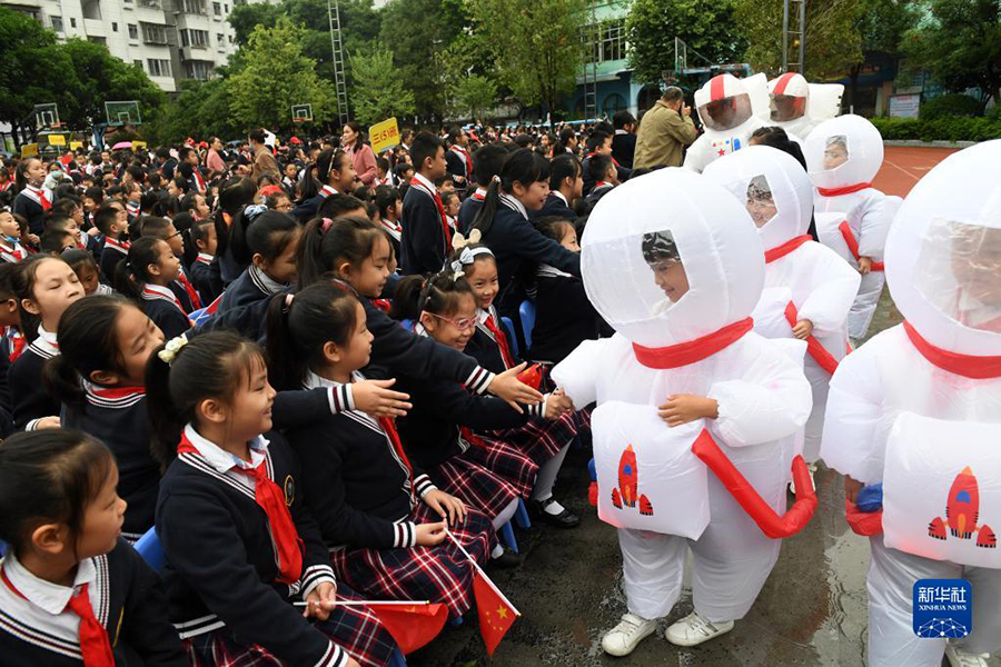 10月19日,在廣西河池市金城江區第三小學,學生在科學節活動現場和身穿充氣仿真太空服的同學互動。(新華社記者 陸波岸/攝)