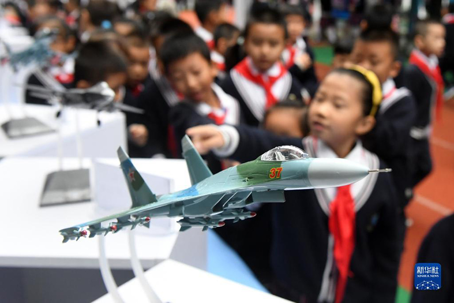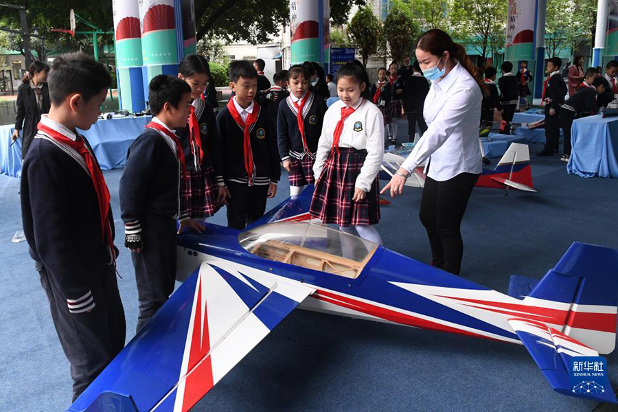 10月19日,在廣西河池市金城江區第三小學,學生在參觀科學節活動現場展出的飛機模型。(新華社記者 陸波岸/攝)