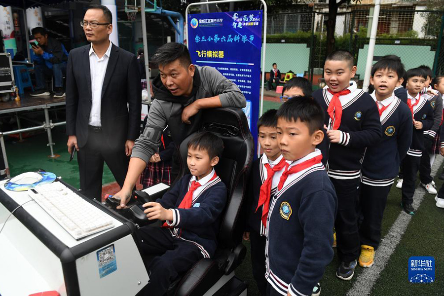 10月19日,在廣西河池市金城江區第三小學,學生在科學節活動現場操作飛行模擬器。(新華社記者 陸波岸/攝)
