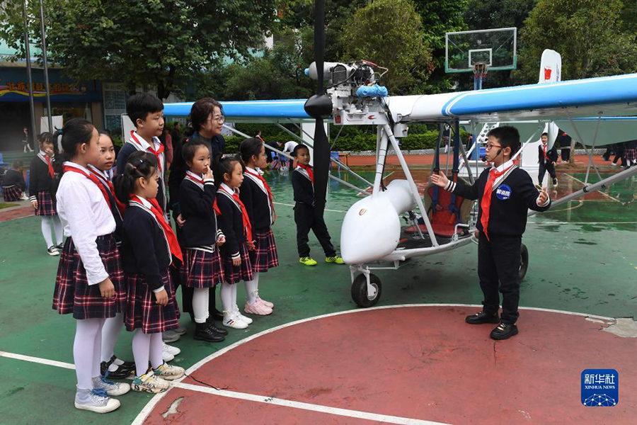 10月19日,在廣西河池市金城江區第三小學,孩子們在科學節活動現場觀看無人機飛行表演。當日,廣西河池市金城江區第三小學舉辦第六屆科學節,活動以探究航空航天等科學奧秘為主線,通過觀摩、互動、體驗等形式,助力孩子們放飛航天夢想。(新華社記者 陸波岸/攝)