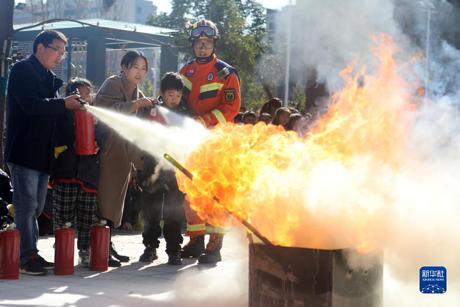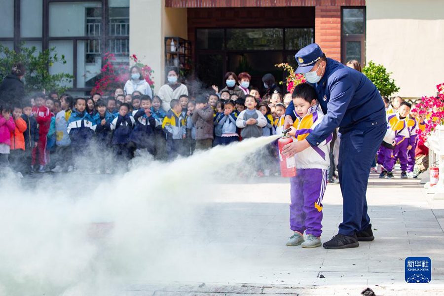 11月8日,在南京市雨花臺區宏圖上水幼兒園,小朋友在消防員的輔助下體驗使用滅火器。(新華社發 蘇陽/攝)