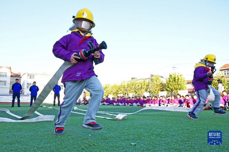 11月8日,山東省棗莊市市中區東湖小學的學生在操場上做消防趣味游戲。(新華社發 孫中喆/攝)