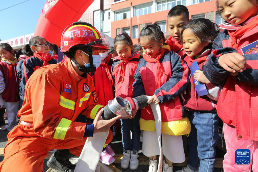 11月8日,江蘇連云港市南城中心小學的學生在體驗消防設備的使用。(新華社發 耿玉和/攝)