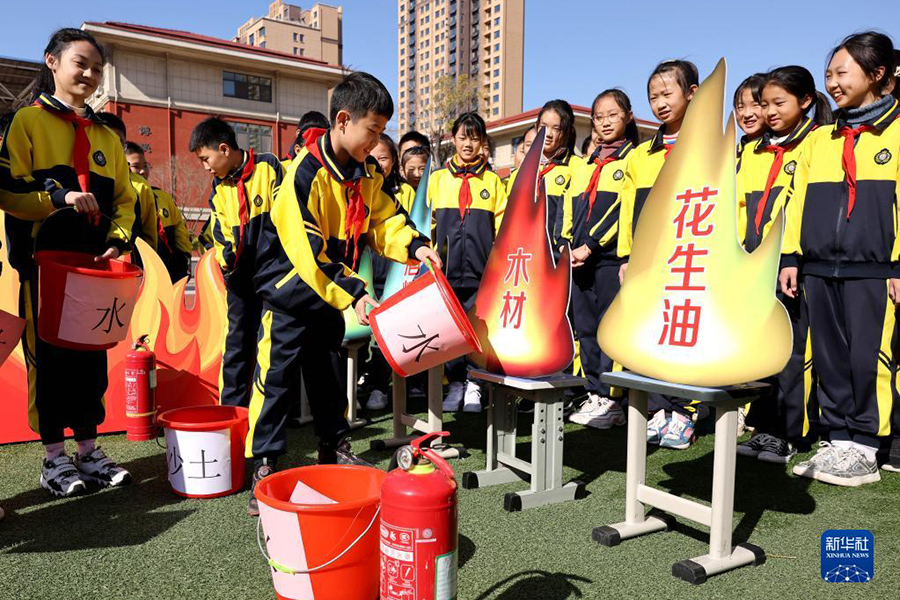 11月8日,在安徽省淮北市泉山路學校,師生們在消防員的指導下學習滅火技能。(新華社發 萬善朝/攝)