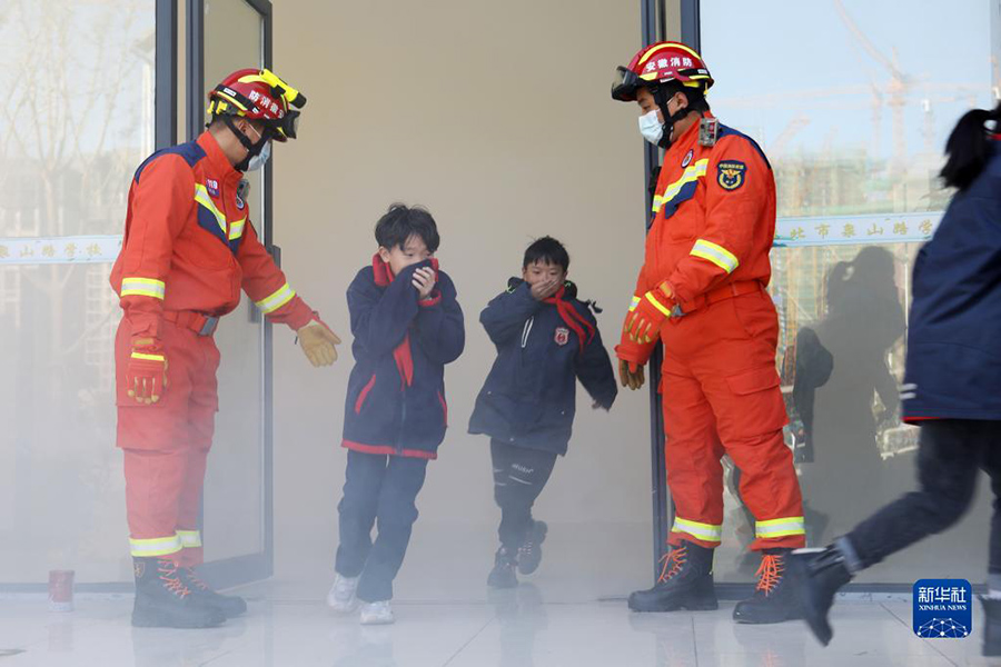 11月8日,在安徽省淮北市泉山路學校,學生們在消防員的引導下進行火場逃生演練。(新華社發 萬善朝/攝)