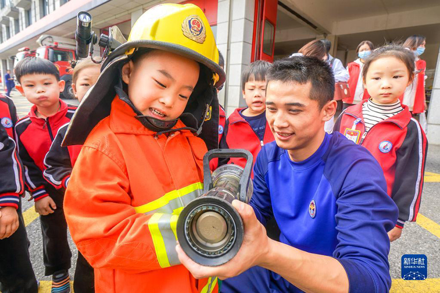 11月8日,在南京市雨花臺區宏圖上水幼兒園,小朋友在消防員的幫助下試戴消防頭盔。全國消防日來臨之際,各地開展消防安全宣傳活動,提高人們的消防安全意識與應急避險能力。(新華社發 蘇陽/攝)