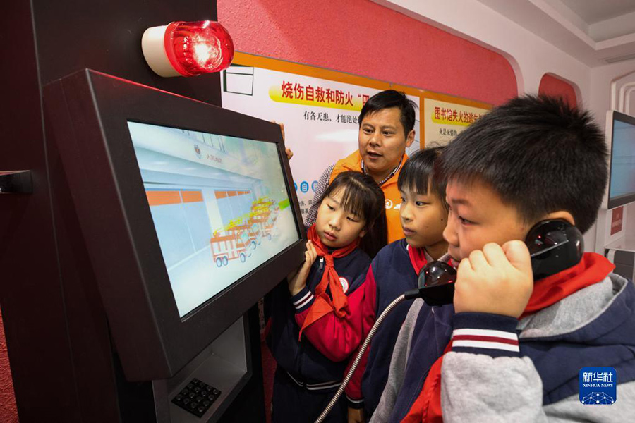 11月8日,在浙江省湖州市長興縣實驗小學消防館內,學生們體驗消防報警流程。(新華社發 譚云俸/攝)