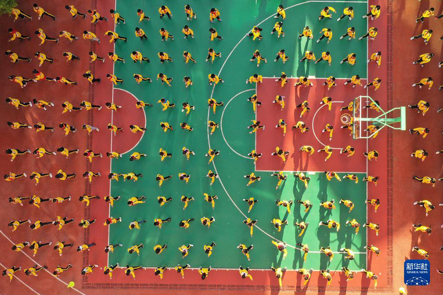 11月10日,衡陽市雁峰區環城南路小學的同學在做《國學武術操》(無人機照片)。(新華社發 周仲輝/攝)