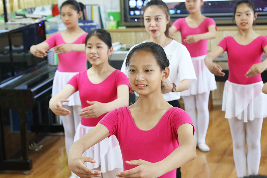 北京市密云區北莊鎮中心小學舞蹈工作室教師在指導舞蹈團學生進行芭蕾舞手位組合練習。(本報記者 樊世剛/攝 通訊員 趙長順/文)