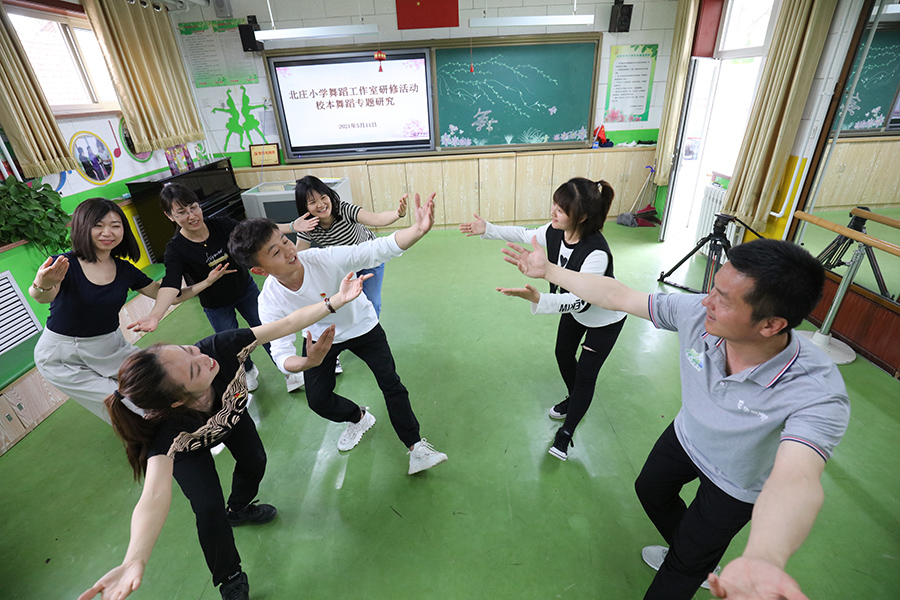 為提高教師教學水平,學校為首都師范大學舞蹈專業畢業的青年教師楊賢專門建立了舞蹈工作室。這是楊賢(中)在為其他學科的教師進行舞蹈專業培訓。(本報記者 樊世剛/攝 通訊員 趙長順/文)