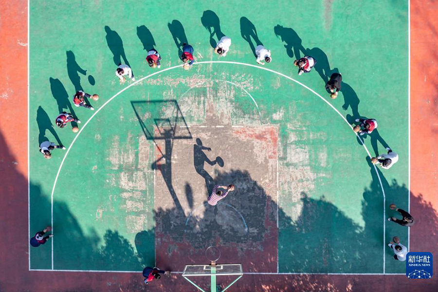 12月21日,學生在貴州省黔西一中上籃球課(無人機照片)。(新華社發 范暉/攝)