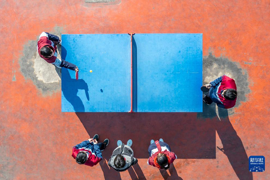 12月21日,學生在貴州省黔西一中練習乒乓球(無人機照片)。