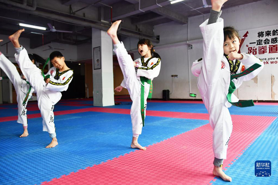 1月18日,孩子們在湖南省永州市江永縣一家跆拳道館學習跆拳道。(新華社發 田如瑞/攝)