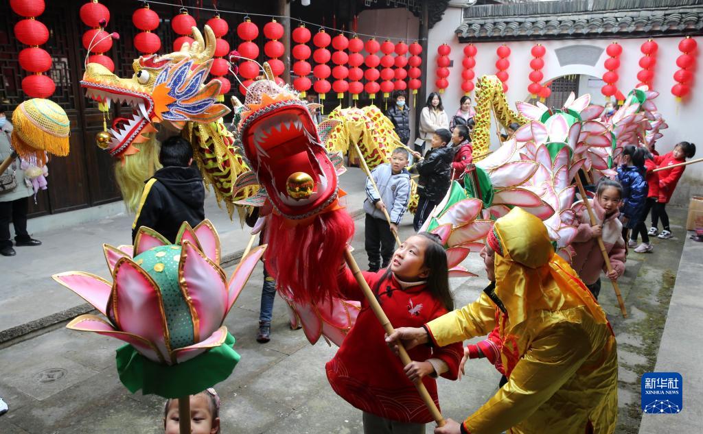 1月19日,在浙江省湖州市德清縣乾元鎮新時代文明實踐站,孩子們在學習舞龍。(新華社發 倪立芳/攝)
