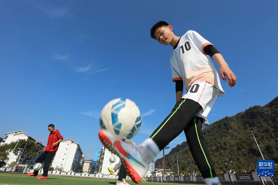 1月19日,湖南張家界市武陵源區的小朋友練習足球。(新華社發 吳勇兵/攝)