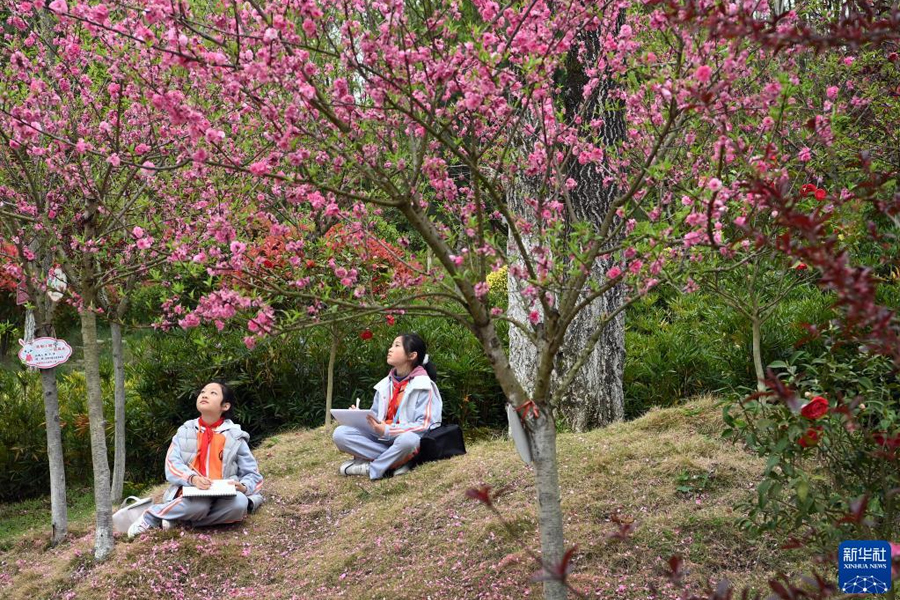3月31日,嵐皋縣城關第二小學的學生在巴山珍稀植物園寫生。(新華社記者 陶明/攝)